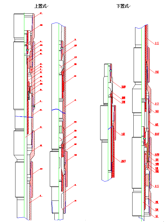 要,可上提桿柱1—1.5米后快速下放將鎖簧闖入鎖定。另,在上置式結(jié)構(gòu)中,φ38和φ44泵以及在3寸油管中生產(chǎn)的泵可以不配套脫節(jié)器生產(chǎn),其余均應(yīng)配套脫節(jié)器生產(chǎn)。(尾管內(nèi)加重桿下泵前同泵中心密封桿聯(lián)結(jié)好后一同下入)